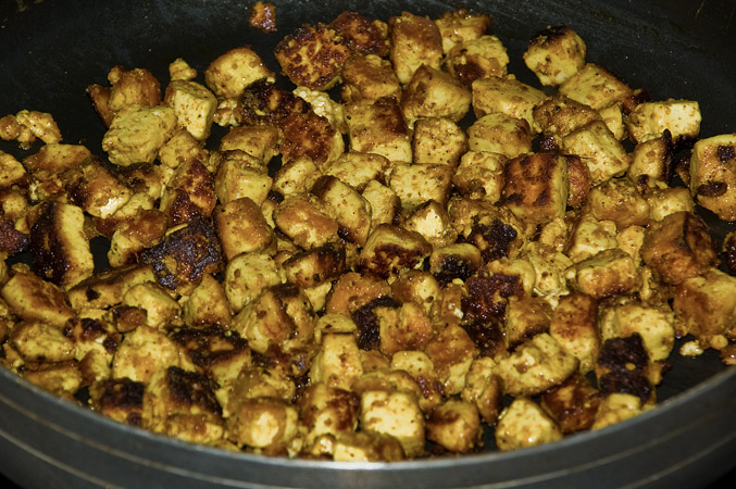 Spongy, juicy chunks of paneer soaked in spicy masala and curd and shallow fried! Great as a starter and as an accompaniment with rotis.