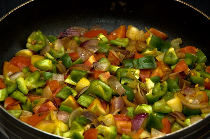 Pour 1 tbsp oil on the pan and empty the finely chopped garlic and split green chillies. When these are done, add diced onion, tomato, and capsicum. Shallow fry these until half cooked. Do not overcook.