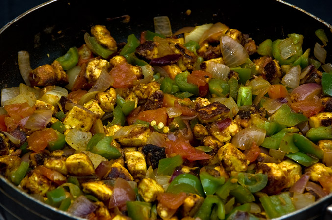 Pour 2 tbsp oil on to a pan. Empty the marinated mixture into this pan. Let this cook in medium heat. Constant stirring is not required. Let this cook until the sides of the paneer are brown and crisp. Remove paneer from the pan and keep aside.