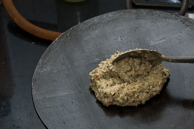 Grind the dals and rice along with shallots, red chilies, and curry leaves to make a coarse paste. Ensure that the batter is very coarse and not watery. Add salt. The trick to get the right consistency is to remove all water from the soaked rice and grind with very little water.