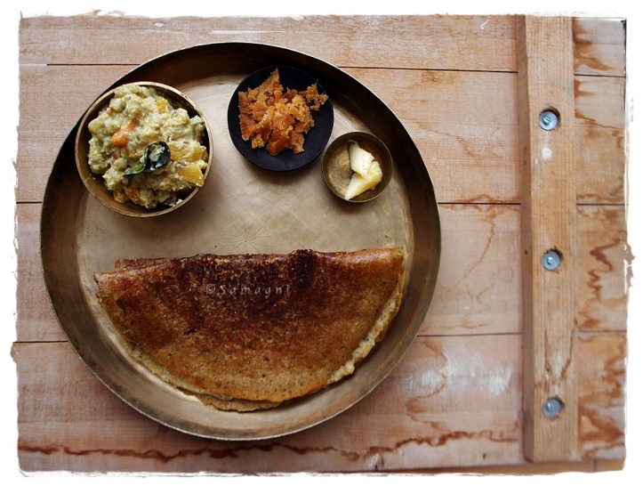 Instant, crispy, filling, spicy, hot and healthy! Served with avial, jaggery, and butter – a beautiful blend of the Tamil and Malayalam food culture. Perfect breakfast for cold winter mornings. You need that sesame oil intake to keep your skin supple and moist during winter. Lentils, shallots, curry leaves, and asafetida make this a very healthy and protein-rich breakfast. Remembering my grandmother, Rukmini, and my valiamma, Madhavi, who were famous for their special ada dosa (at home we call this varatti). Relatives who are planning to visit would inform in advance so that my aunt can prepare and be ready with the batter. Both and grandma and valiamma wouldn’t use a ladle to spread the thick batter on the hot dosa tava. They would spread it with their hand. I think their love found way into the food also!