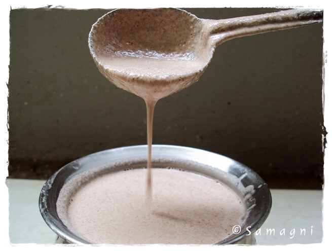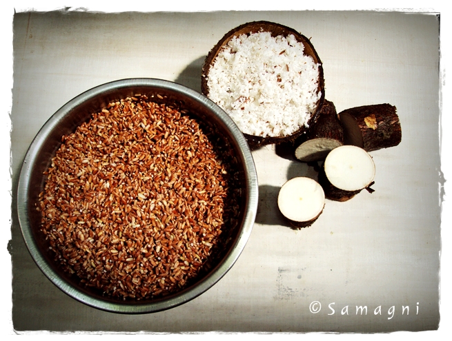 Wash and soak raw rice for 2-3 hrs. I used unpolished raw red rice. Wash, peel, and cut the tapioca into small pieces. Grind the rice, grated coconut, and tapioca pieces together to make a fine paste. Add salt and water and dilute. The batter should be a little more dilute than the normal dosa batter consistency.
