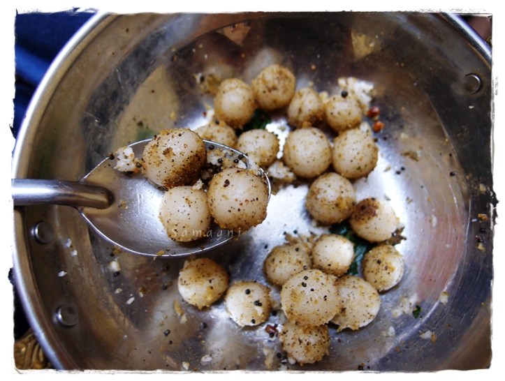 Heat a tsp of oil in a pan and crackle mustard, urad dal, chana dal and the curd chillies. When the mustard crackles, add hing and curry leaves. Add the steamed kozhukatais and stir for 5 minutes. Stir carefully ensuring that the kozhukatais do not break. Add freshly grated coconut and milagi podi (optional). Turn off and serve with coconut chutney. This is a healthy breakfast/snack item as it is steamed.