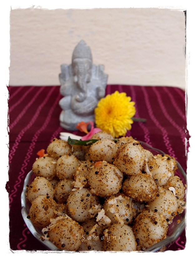 Soft and chewy steamed rice balls with a tadka and grated coconut. An easy and yummy snack item also made during Ganesh Chathurthi. This dish is also made on the occasion when small children start crawling and crosses the doorstep (vashal padi). Kids of this age would be teething and Ammini Kozhukkattais are a safe option to bite into, any day much better than plastic teethers.