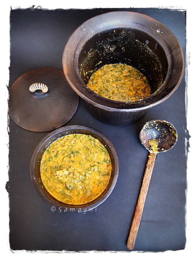 A healthy and tasty spinach/amaranth leaves and dal combo that tastes good with rice. Does not have too many spices, a simple, no-frills curry. I make this often as it is easy. It is a dish you can cook when you are not in a mood to make side dishes. This serves as a sumptuous dish and goes well with rice and chappathi. Also called molagoottal in Tamil, this is a dish Palakkad Iyers make often.