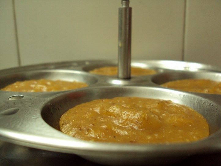 If you choose to use an idli mold, lightly grease the idli molds with ghee. Pour one ladle full batter into each idli mold. Steam in a pressure cooker for 10 minutes. Turn off fire, take out the idli mold from the pressure cooker, and let it cool.
