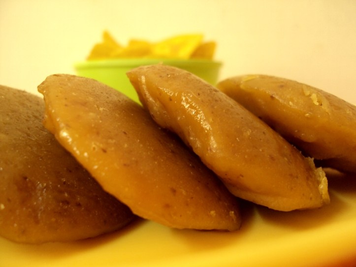 After they cool down a little bit, the sweet pouches start separating from the edge. Use a spoon to lift the pouches off the mold and place on a serving plate.