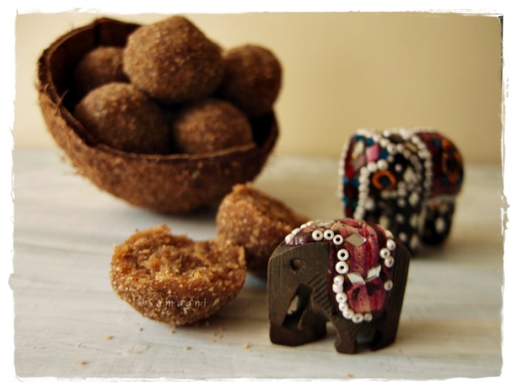 2. Some jaggery varieties are not moist enough to hold together and firm up the laddus. In such cases, you will need to use jaggery syrup instead of powdered jaggery for the laddus. Make jaggery syrup by adding a cup of water to the jaggery and heating it. When the jaggery is diluted, strain it to remove impurities. Then, boil the strained jaggery syrup to a string consistency. Turn off the heat. Add small quantities of this syrup to the mixture of powdered grains and coconut/roasted copra. Add enough to moisten the powder and then use your palm to shape into laddus. You can roll the shaped laddu on some dry powder to firm it up a little bit. Make sure that the jaggery syrup that you add to the powder is warm enough. For this, you may have to reheat the syrup depending on the time you take to shape the laddus. But you cant keep the syrup on flame all the while that you are making the laddu because that will make it too thick and sticky.