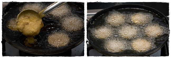 Place the unni appam mold (paniyaram pan) on fire and add ghee/coconut oil. When you start getting the smell of oil/ghee, turn fire to medium. Pour spoonfuls of batter into each pit. When the sides turn golden brown, turn over the unni appam. Keep turning the unni appams in between, till you get a dark golden brown color on both sides. Remove from oil, and drain on kitchen towels/tissue paper, and serve.