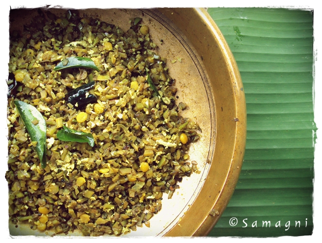 When banana chips are made at home, I am more interested in a by-product than the chips – the banana peels. Raw plantain peels are extremely fibrous and nutritious. We always use them to make stir fry subzi (thoran). Simple to make and delicious. Add some mung bean sprouts to them, to get protein along with fiber. You can also add chana dal like in the pictured version.
