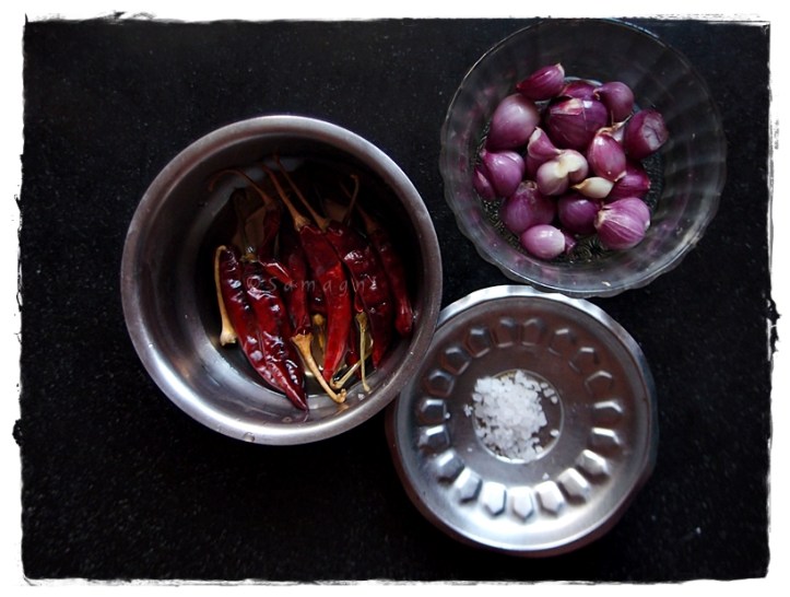 Soak the red chilies in a little bit of water for 1-2 hours. Peel the shallots. If you are using the stone grinder, first crush the red chilies and grind them a little bit. Add the shallots. Add salt. Do not add any water while grinding in a stone grinder. Keep grinding. Be prepared to shed plenty of tears while grinding. Grind until you get a smooth paste. Gather into a bowl.