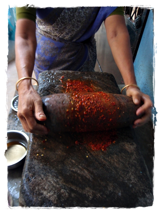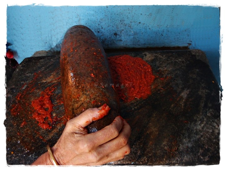 My mother grinds this chutney in ammikkallu (a stone grinder with a flat stone surface and a pestle that is rolled on this surface). This chutney tastes best when ground using stone. The mixer grinder tends to mildly heat up the ingredients due to the high speed. Grinding using stone retains all the natural flavors of this minimalistic chutney. My mother would be in tears by the time she is done with the grinding because of the shallots. Also your hands can be get heated up because of the chilies. You can use a mixer also to make this chutney. You could use red chilly powder but the chutney tastes best when you use whole dry red chilies. When grinding this chutney in a mixer, soak the dry red chilies in water for an hour. If you are in a hurry, pour hot water in the chilies and keep aside for 5 mins before you start grinding. Adding coconut oil to this chutney is key as it adds a wonderful flavor and helps you tolerate the fiery chutney.