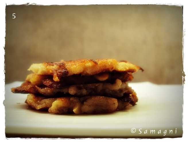 Did you know that overripe bananas with black spots have more nutritive value and more antioxidants than the yellow spotless ones? Overripe bananas are difficult to eat as is, but they are easier to cook, especially smoothies. Here is a pancake that you can make with overripe bananas. Kids are going to love this one. Some not-so-small kids will love it too. 🙂 The below recipe makes four 3-inch size uthappams.