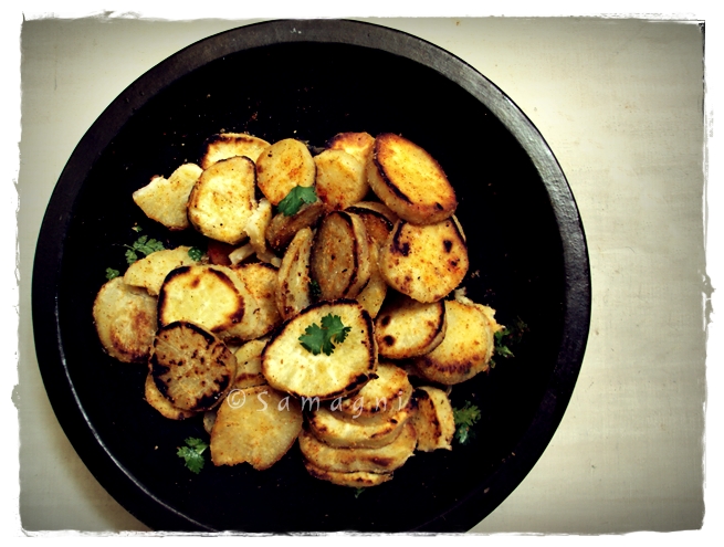 Boil sweet potato. I pressure cooked it to one whistle. Peel and slice into round pieces. Pour oil on a hot tawa. Place the sliced sweet potato pieces on the tawa and roast until sides turn crisp. Flip the potato pieces and roast the other side also. When both sides are crisp enough, remove and place on an absorbent tissue paper. Put all the roasted pieces into a bowl and sprinkle red chilly powder, salt, chaat masala, and add lemon juice. Toss until all pieces get coated with the powders and lemon juice. Garnish with coriander leaves. Roasted sweet potato is ready to serve.