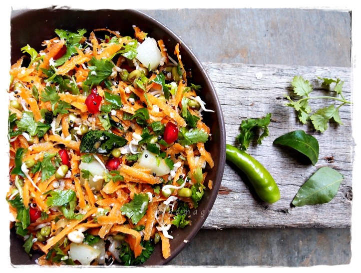 I am happy to skip my afternoon rice lunch or evening dosa and just have a bowl full of this salad. It is so easy to prepare, very delicious, nutritious and filling too. It is a very popular and traditional Karnataka salad. This is also made during Ram Navami celebrations.