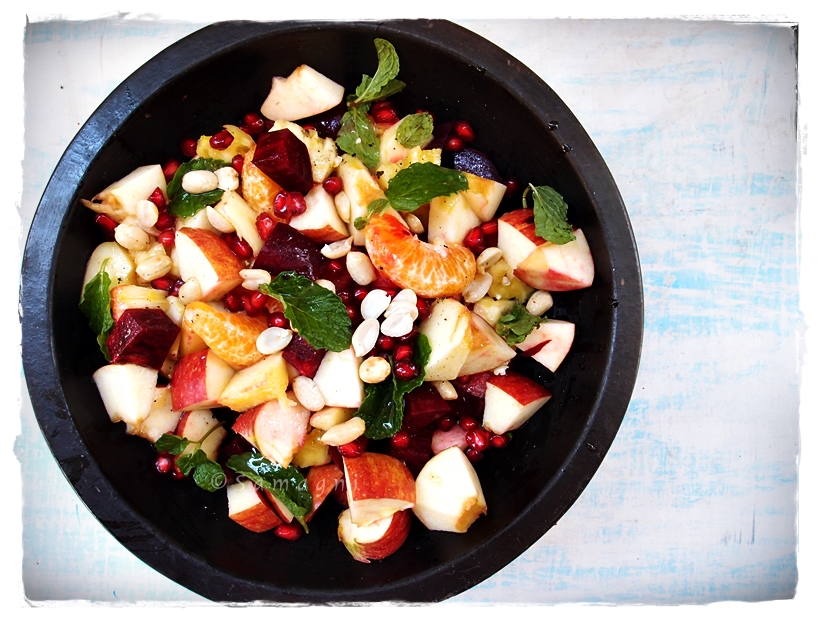 Boil the beetroot, peel the skin, and chop into cubes. Dice the watermelon, pineapple, and apple. Remove the orange peel of one of the oranges and separate the segments. Add this along with the diced fruits and beetroot. Add pomegranate kernels also into this.