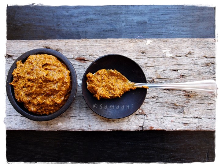 cooked pumpkin fibers, tamarind, and salt along with this and pulse to make a coarse