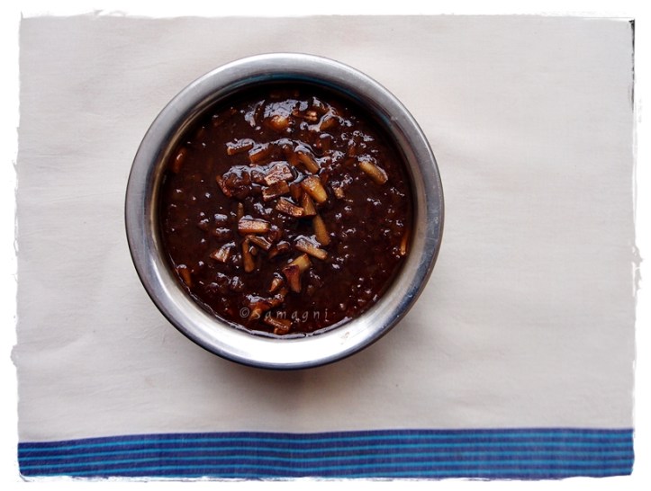 Meanwhile, as the rice gets cooked, soak jaggery in warm water (1 cup – do not make it too dilute). Heat this solution until all the jaggery pieces dissolve completely. Pass this solution through a strainer to remove impurities if any, and keep the solution aside.