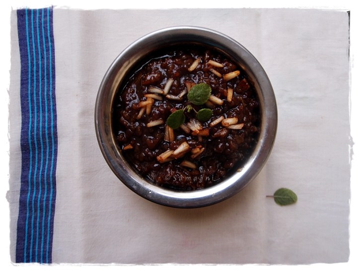 Navara can be used to make rice gruel / kanji or to make jaggery payasam. The traditional sweet offering / prasadam / neivedyam, especially at Devi temples, are made from raw rice, jaggery, and ghee. The payasam is prepared on firewood and cooked in an uruli, a heavy brass vessel. This payasam is thicker in consistency and is a little too sweet compared to other payasams. It has lots of ghee and is supposed to be eaten only in small portions. This payasam is also called kadu madhura payasam, i.e. very sweet payasam. I have not used as much jaggery or ghee as they would ideally in a temple prasadam. You could add more, if you prefer so.