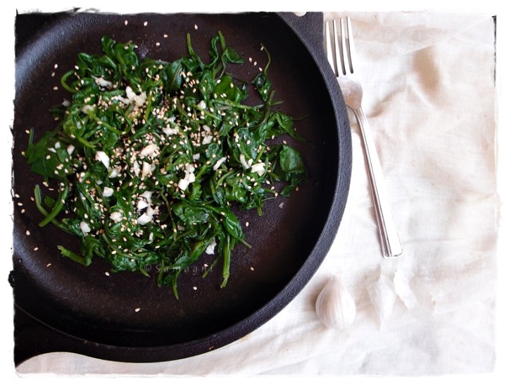 If the spinach is too long, use your hands to shred them into smaller size. Add crushed garlic, sesame oil, sesame seeds and toss well to mix and coat the spinach with these ingredients. Crushing (not chopping) the garlic works best and brings out the flavor very well.