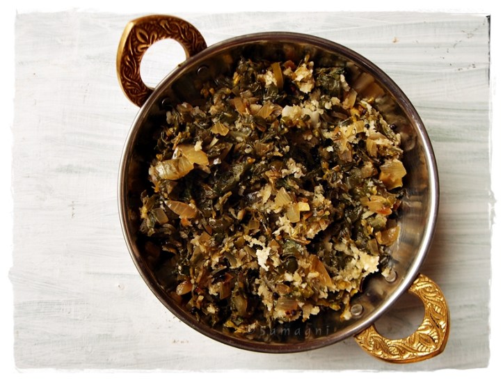 Cook in slow fire for about 5 mins stirring occasionally. The leaves will shrink and become soft and darker in color.