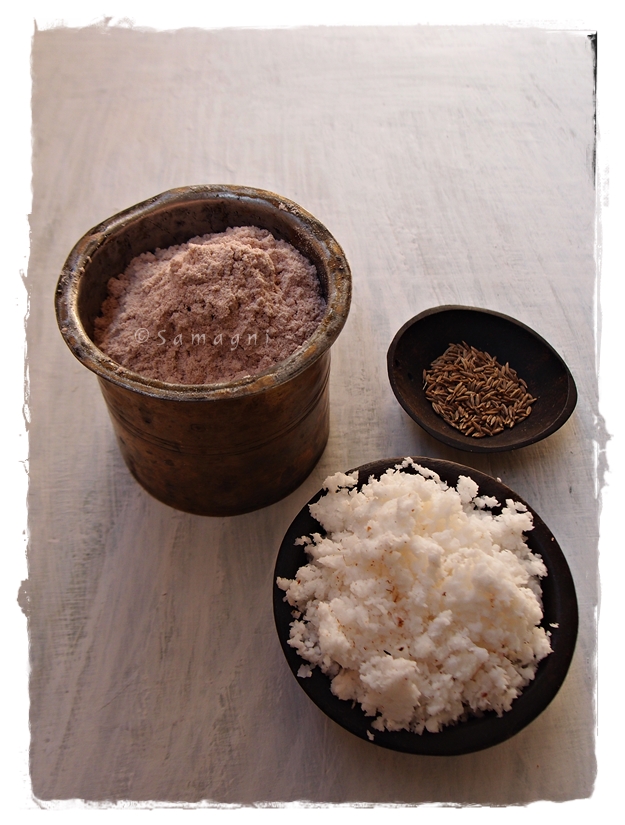 Take raw rice flour (I used raw red rice flour and hence the color difference), lightly crushed cumin seeds, grated coconut, and adequate amount of salt needed in a wide vessel. Add water (at boiling point) into this mixture.