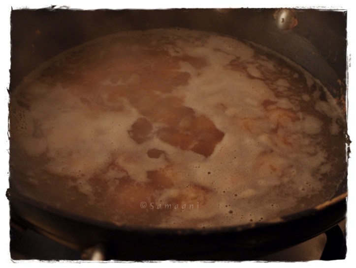 Add 2 cups of water in the heavy bottomed pan. Drop the rice balls into this boiling water.