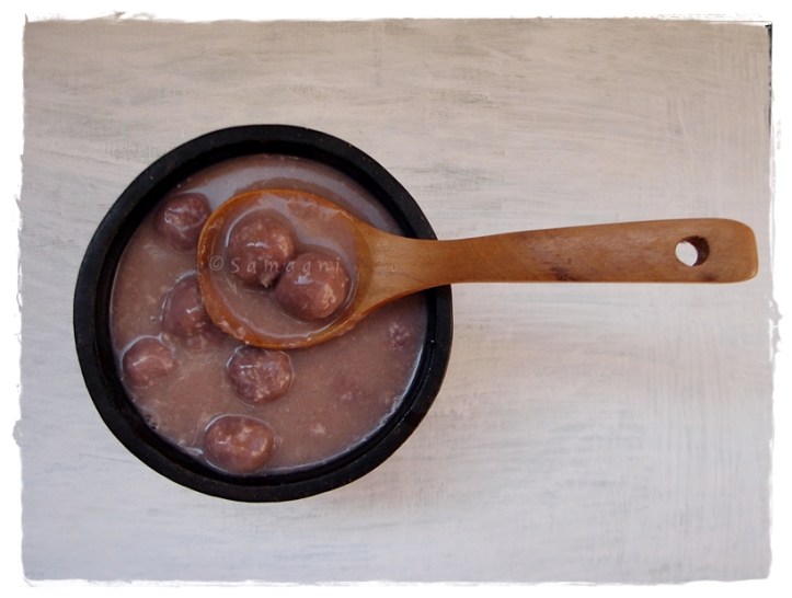 You will notice that the water is thickening and the rice balls are becoming firmer.