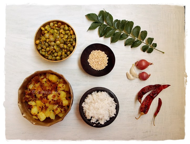 A side dish made of potato and raw pigeon peas garnished with spiced up grated coconut. A good side dish for rice or roti. Raw pigeon peas are available in the market during winter. This is nothing but toor/Arhal dal at its raw stage. It is a good source of protein for vegetarians.