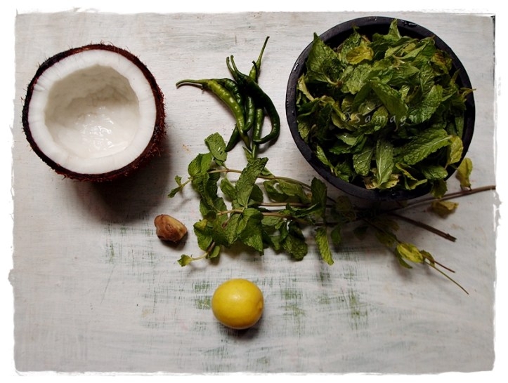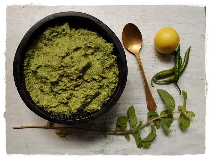Green chutneys are a great way to add raw greens in your diet. This mint/pudina chutney is simple to make, tangy, and flavorful. You can replace mint with coriander and make coriander coconut chutney also and add variety and different kinds of flavor and goodness to your diet.