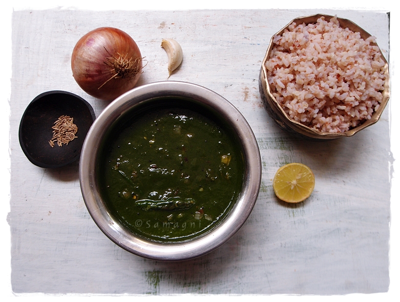 Spinach/Palak leaves are healthy, rich in iron and nutrition. This super simple palak recipe is made with limited ingredients and goes well with rice as well as roti. In this recipe, I have steamed and pureed the spinach leaves. You may choose to just use chopped spinach leaves. I prefer the pureed spinach. You may also add cooked tur dal/split pigeon peas or split mung dal to this curry to increase volume and nutrition.
