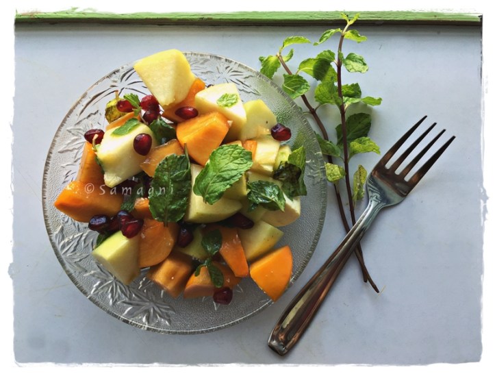 Fruit salads are my favorites more than vegetable salads – Not the ones with a dollop of ice cream but the kinds that have just real fruits with some lemon juice dressing. Eating fruits as-is is good enough but a pinch of black salt, a dash of lemon, and a few mint leaves lends them an exotic flavor. Chill them a little in the refrigerator and it turns delectable. Late October and November is the season for both persimmons and pomegranates. This is the best time to make this salad with these seasonal fruits. I first ate persimmon two years ago during a visit to Bhutan and had never seen them in India. Couple of days ago I was surprised to come across these in the local market. Glad to see that Persimmon is cultivated even in India. Even if you do not have persimmon, you may substitute it with the crunchy variety of pear to make this salad. But it is important that you use the crunchy variety of pear and apple to make this salad. A crunchy and sweet apple gives this salad the right texture. A sloppy squishy sour apple is a bad choice and can ruin the salad.