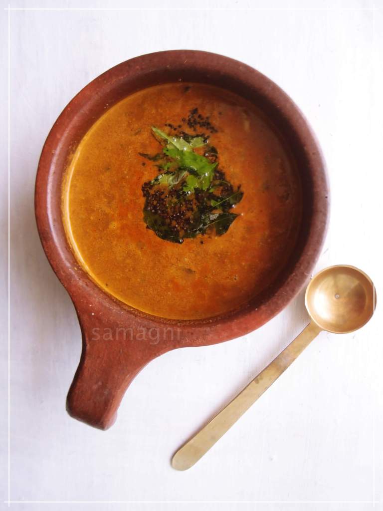 In the North of India, dal (boiled lentils) is a must for every meal, whether it is rice or roti. In the South also, one dish for the meal must contain dal. The other dish, invariably, will be spicy and tangy complementing the bland and sober dal. Puli means tamarind in Malayalam and Tamizh. Puli / tangy taste of the tamarind is the main character of this gravy. Everyone at home loves this dish.