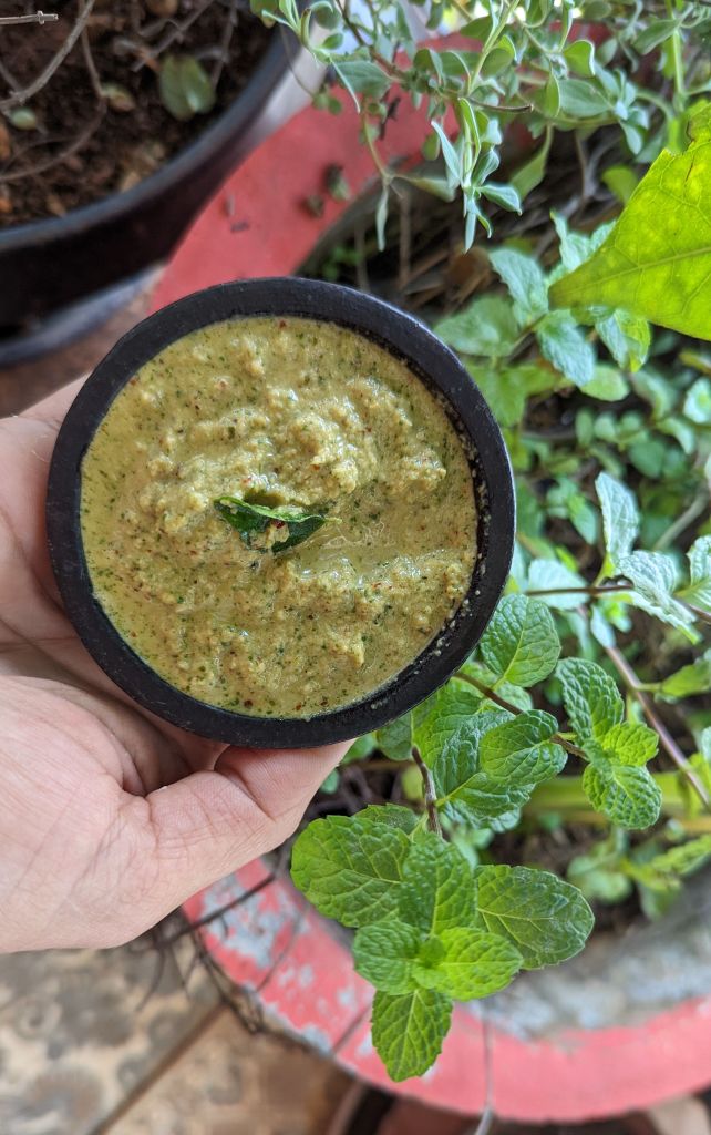 Heat groundnut oil in a pan/iron wok. Roast urad dal in oil until they turn golden and you get the roasted fragrance. Add tamarind, ginger piece, and saute. Remove and keep aside. Roast the whole dry red chilies to remove their raw smell. Keep along with roasted urad dal. Put the mint leaves into the hot pan and saute them until they wilt and change color. Be careful not overdo this step.